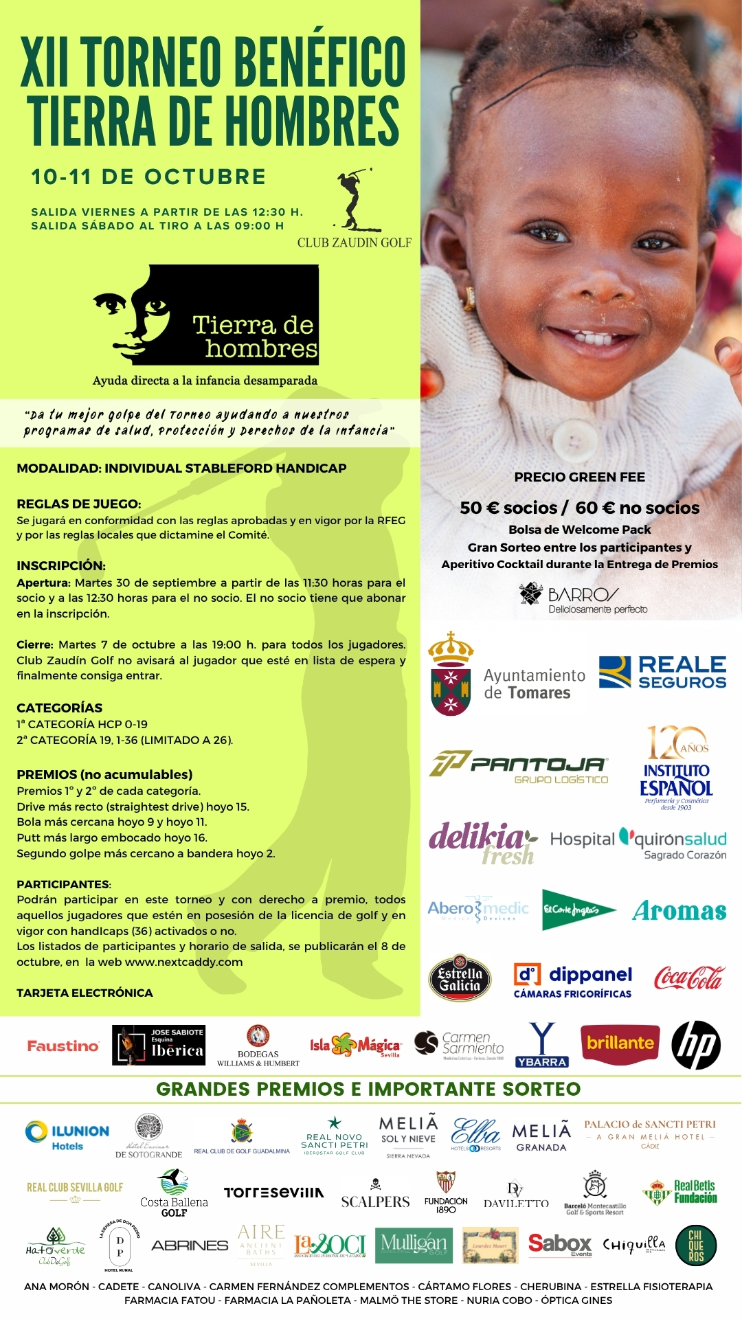 La Fundación Tierra de hombres España celebra los próximos 10 y 11 de octubre en las instalaciones del Club Zaudín Golf (Tomares, Sevilla) la XII edición del Torneo Benéfico Tierra de hombres, un evento deportivo y solidario que reúne cada dos años a jugadores, empresas y colaboradores con un mismo objetivo: apoyar los programas de salud, protección y derechos de la infancia más desfavorecida.